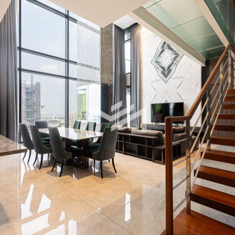 This stunning unit features a spacious duplex layout with high ceilings and abundant natural light and ventilation. The lower floor offers one bedroom, while the upper floor includes two bedrooms, each with its own ensuite bathroom. Located in a prime area of BKK1, within walking distance to all amenities. Positioned on a high floor with breathtaking 360-degree views of the city.