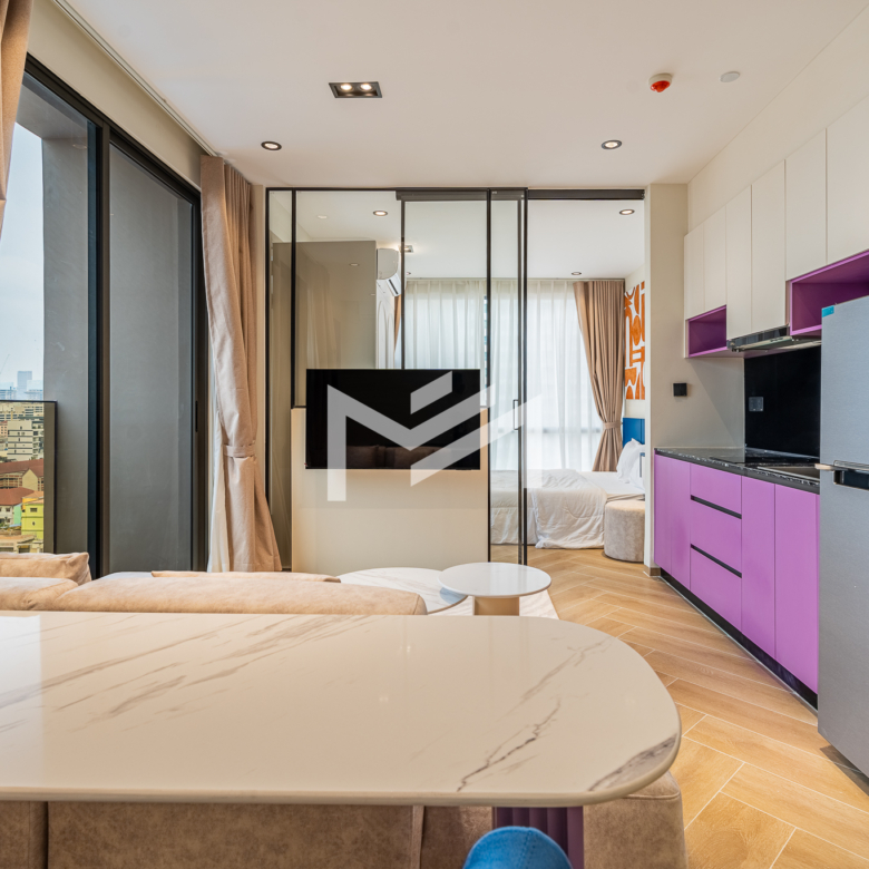 Corner unit, cozy one-bedroom unit filled with gentle evening sun, offering open city views. Thoughtfully designed with brand-new furniture and equipment, the living space opens seamlessly to a private balcony from the living room—perfect for relaxing or enjoying the view. Residents enjoy premium facilities including a welcoming lobby with front desk support, a ground-floor café, rooftop swimming pool, gym, sky bar, and a kids’ playground. Ideally located in the heart of BKK1, one of Phnom Penh’s most sought-after expat neighborhoods, surrounded by cafés, restaurants, supermarkets, and daily conveniences—all within walking distance.