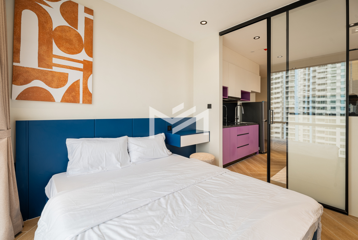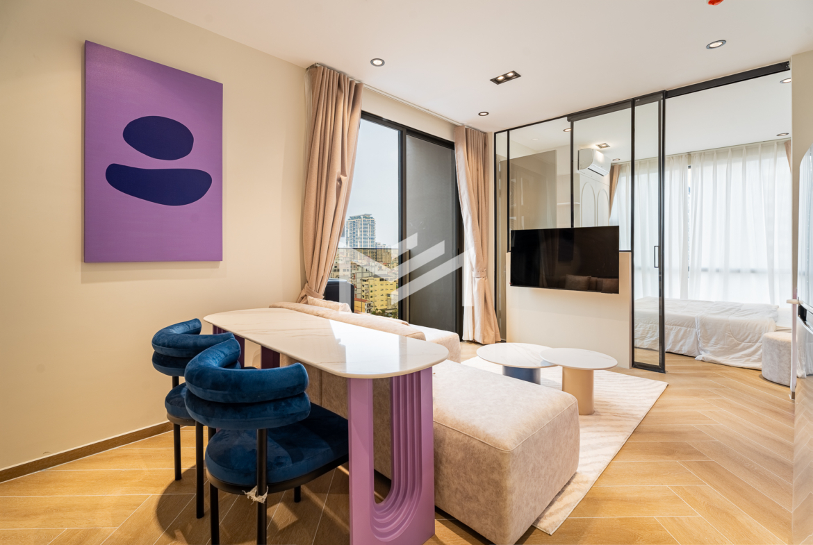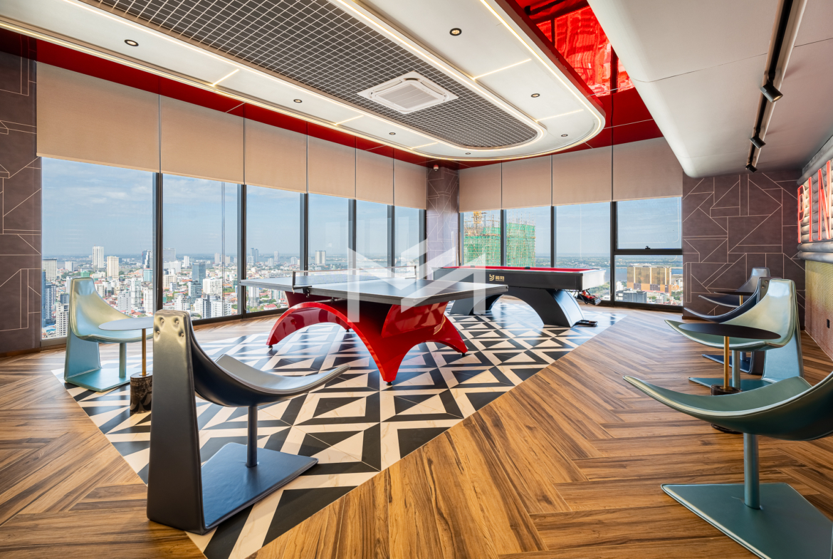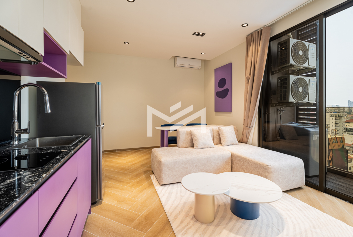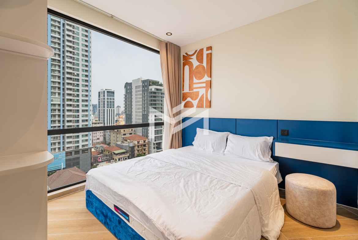 Corner unit, cozy one-bedroom unit filled with gentle evening sun, offering open city views. Thoughtfully designed with brand-new furniture and equipment, the living space opens seamlessly to a private balcony from the living room—perfect for relaxing or enjoying the view. Residents enjoy premium facilities including a welcoming lobby with front desk support, a ground-floor café, rooftop swimming pool, gym, sky bar, and a kids’ playground. Ideally located in the heart of BKK1, one of Phnom Penh’s most sought-after expat neighborhoods, surrounded by cafés, restaurants, supermarkets, and daily conveniences—all within walking distance.