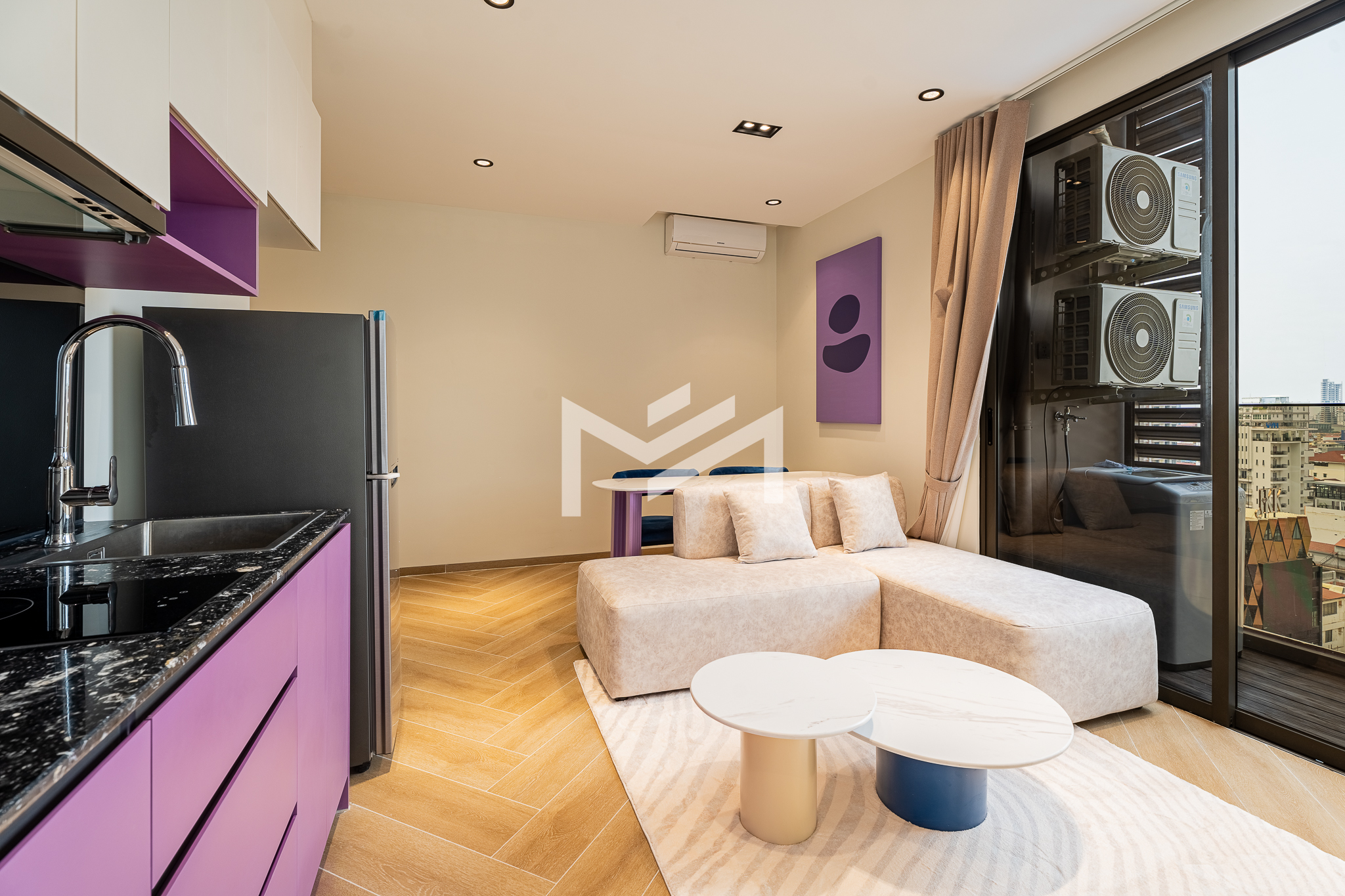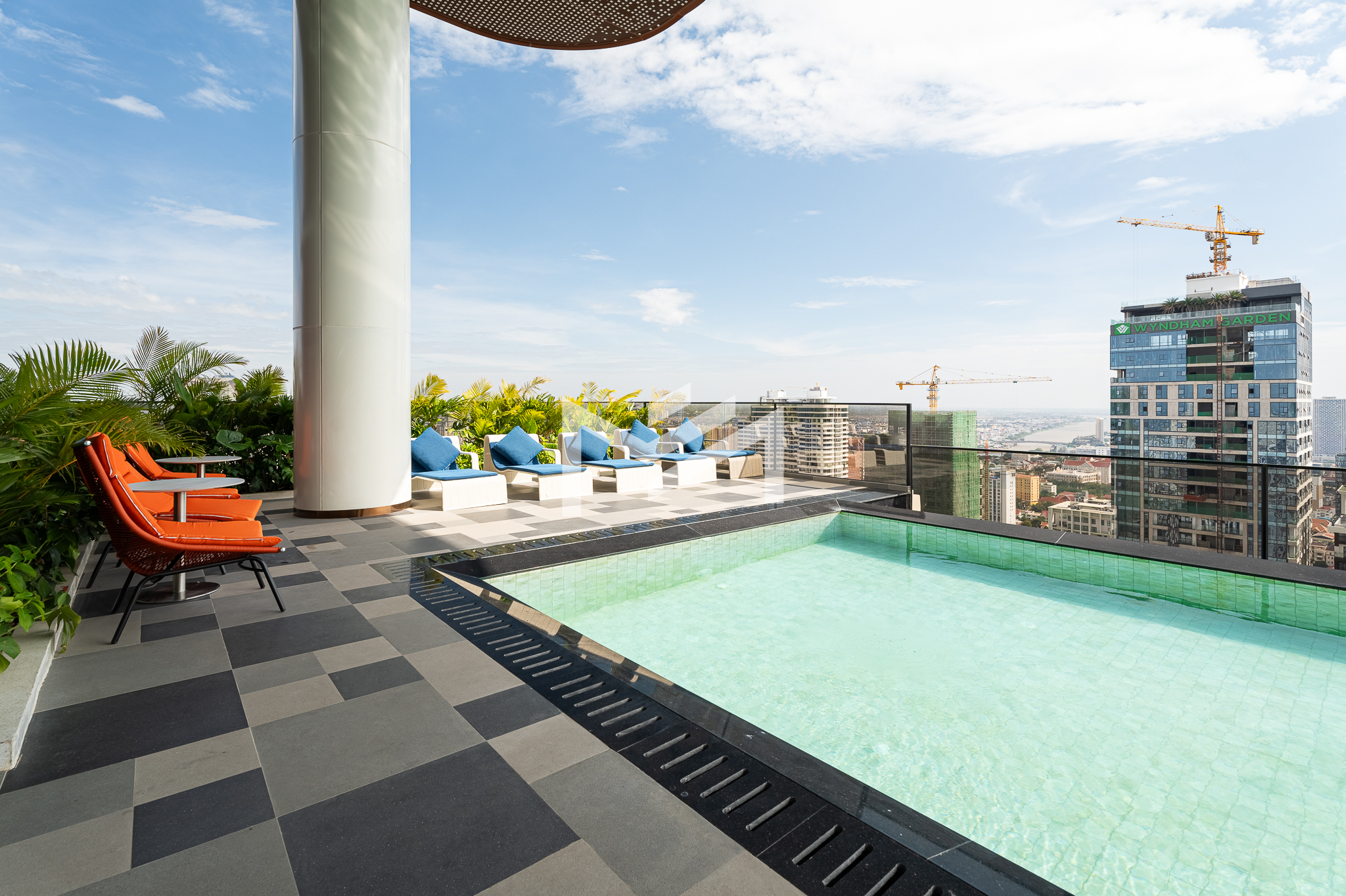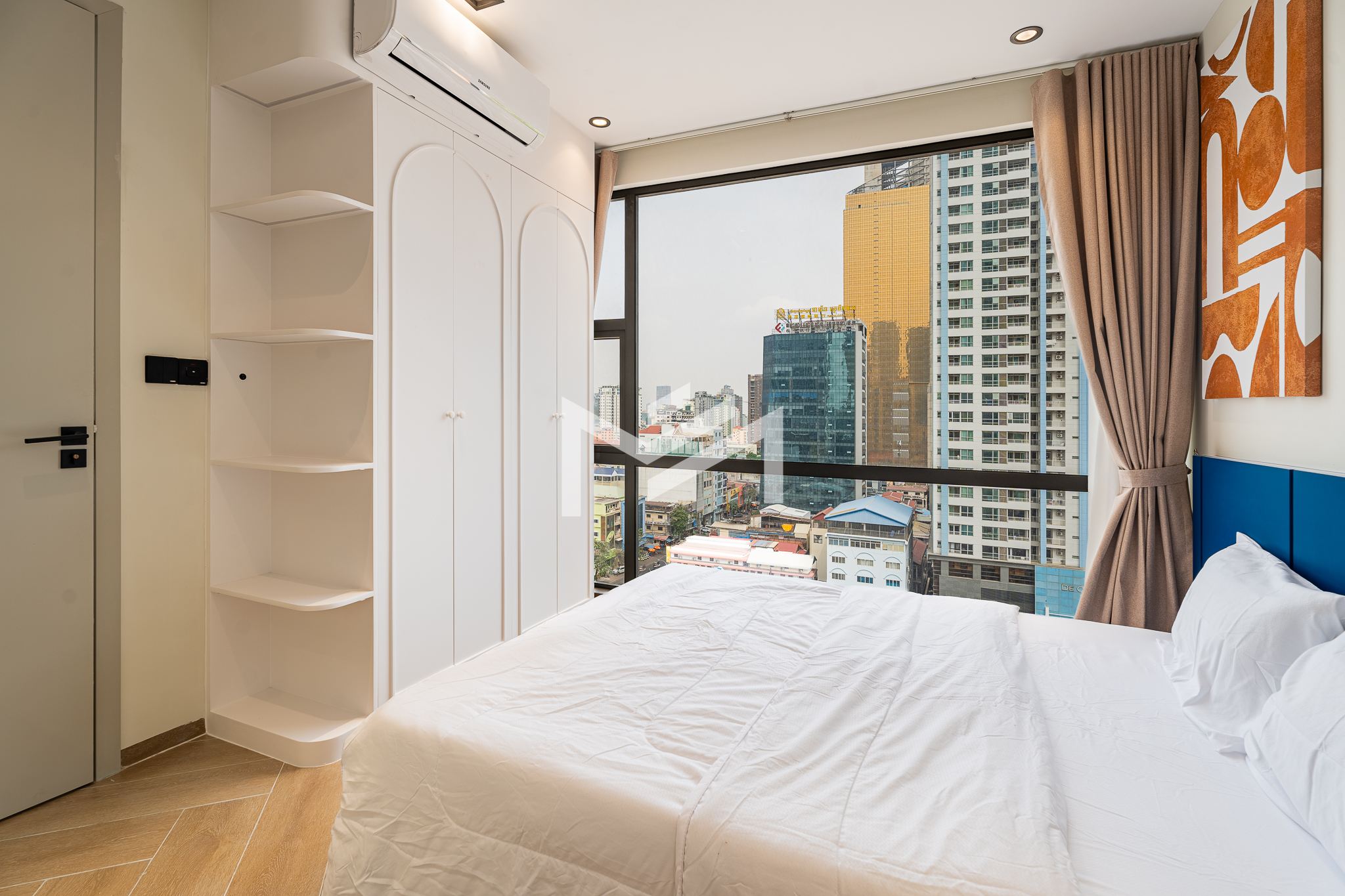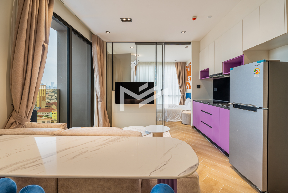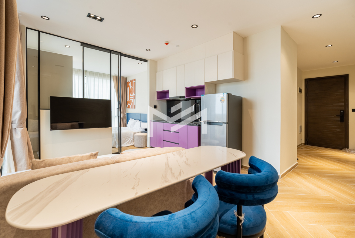 Corner unit, cozy one-bedroom unit filled with gentle evening sun, offering open city views. Thoughtfully designed with brand-new furniture and equipment, the living space opens seamlessly to a private balcony from the living room—perfect for relaxing or enjoying the view. Residents enjoy premium facilities including a welcoming lobby with front desk support, a ground-floor café, rooftop swimming pool, gym, sky bar, and a kids’ playground. Ideally located in the heart of BKK1, one of Phnom Penh’s most sought-after expat neighborhoods, surrounded by cafés, restaurants, supermarkets, and daily conveniences—all within walking distance.