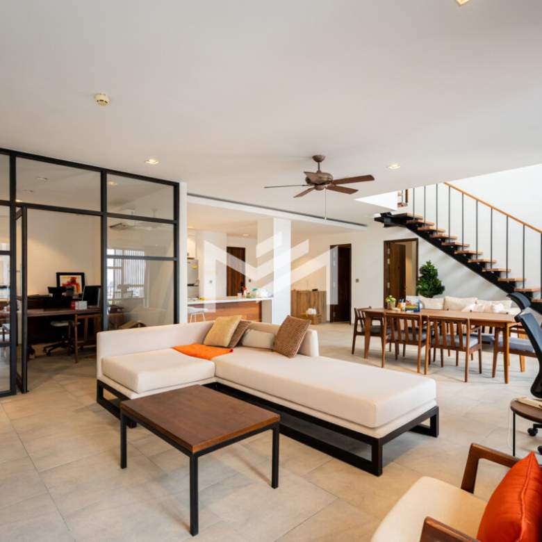 This elegant three-story sky villa offers a unique blend of modern design and homely warmth. Featuring a fully equipped Western kitchen, and a cozy interior bathed in natural light, this triplex is perfect for stylish urban living. The standout feature is a private rooftop garden—your own serene escape in the city. Located just steps away from AEON Mall 2, only 5 minutes to Toul Kork, and 25 minutes to BKK1, it offers both convenience and comfort in one of Phnom Penh’s most connected neighborhoods.
