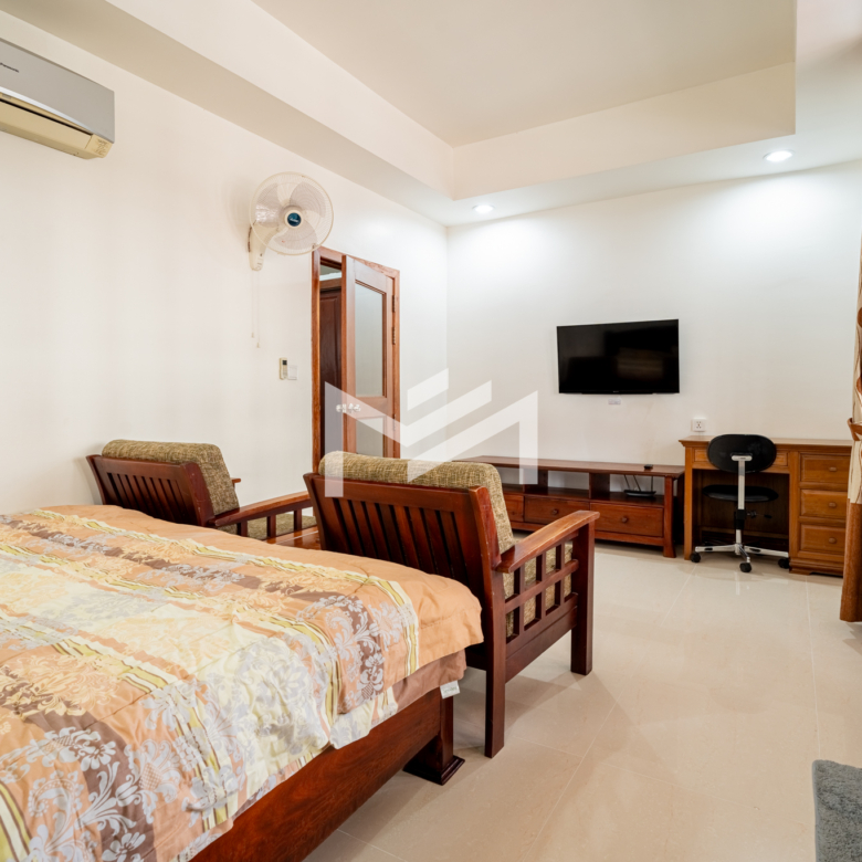 Furnished serviced apartment located west of BKK1 and Daun Penh—just a 10-minute drive from both areas. Set in a peaceful and affordable residential neighborhood, this apartment offers comfort and convenience with full furnishings, cleaning service, and internet included. The building is well-managed with 24-hour security, providing residents a safe and relaxing living environment at an affordable rate.
