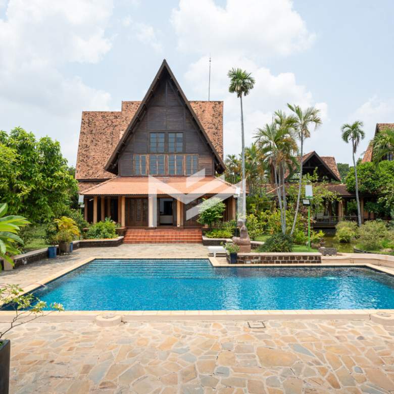 Spacious riverfront property featuring three separate houses within one compound. The main house serves as the central gathering space with a large living area, main kitchen, and 2 bedrooms with 2 bathrooms. The second house offers 4 bedrooms and 3 bathrooms, while the third is a private 1-bedroom, 1-bathroom unit. Surrounded by greenery with a private pool and river views, this property is located off National Road 1, just 15 minutes from Koh Pich and under 10 minutes from The Park community mall. Ideal for families seeking peaceful living away from the city crowds.