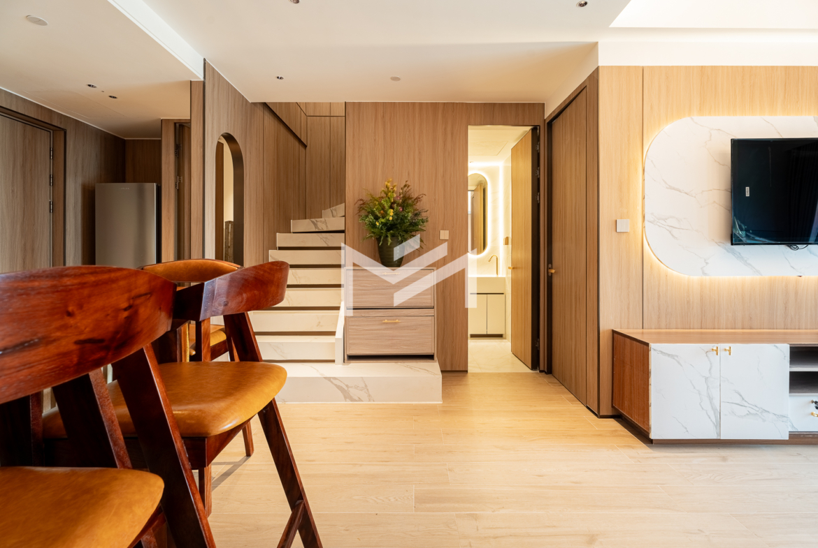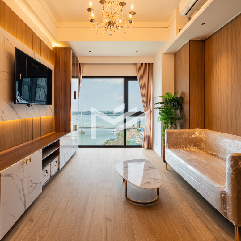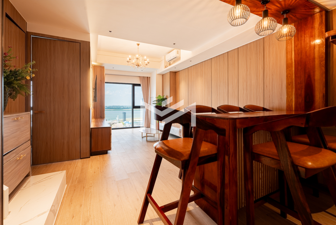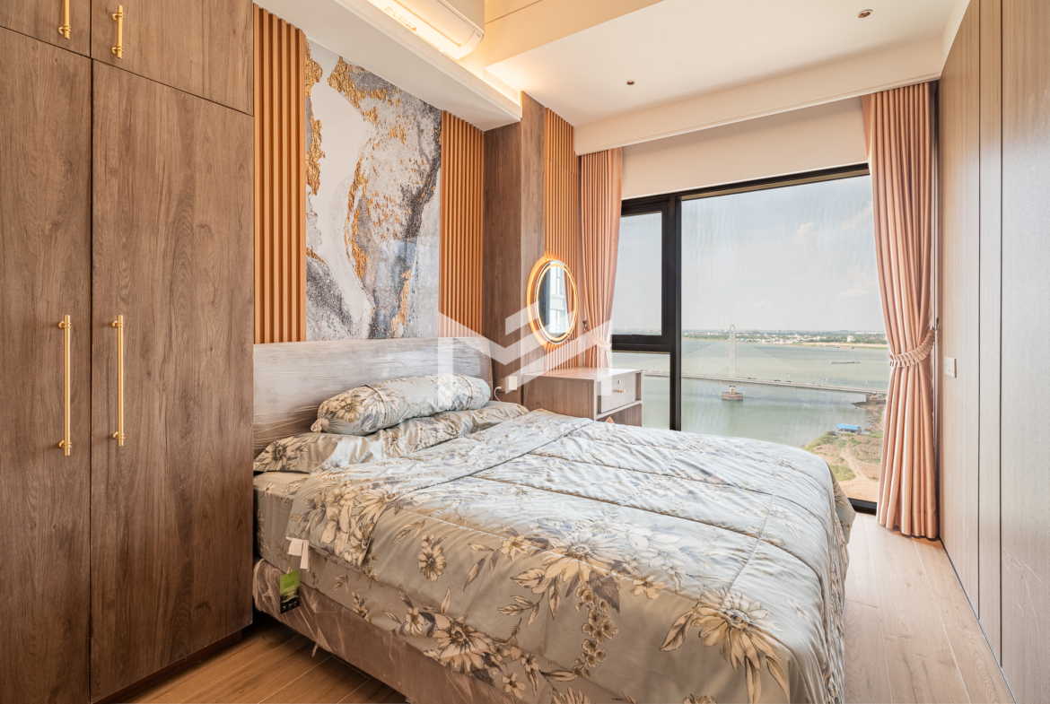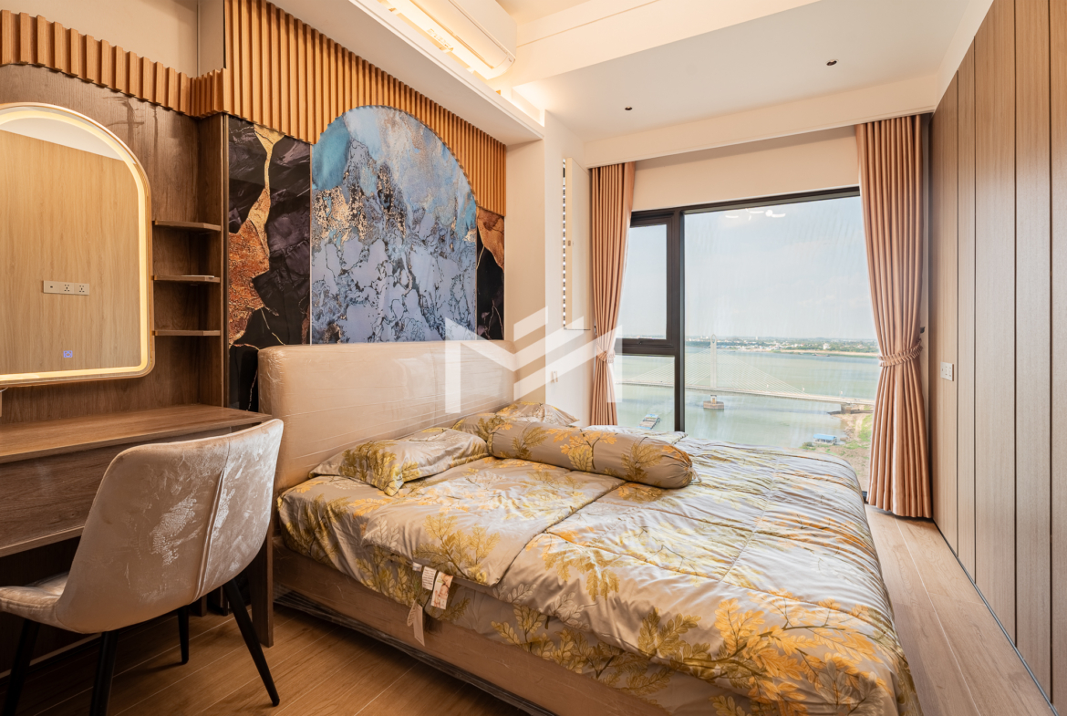 Duplex unit with excellent river views, offering fresh air and abundant natural light throughout the space. The layout is suitable for a family or colleague sharing, providing comfortable and practical living. Located in a brand-new condominium in the peaceful new development area of Koh Norea, the unit is fully equipped and ready to move in with just a suitcase. Residents enjoy rooftop amenities including a gym and swimming pool, while Diamond Island is only about 5 minutes away, making it a cozy and convenient place to live.