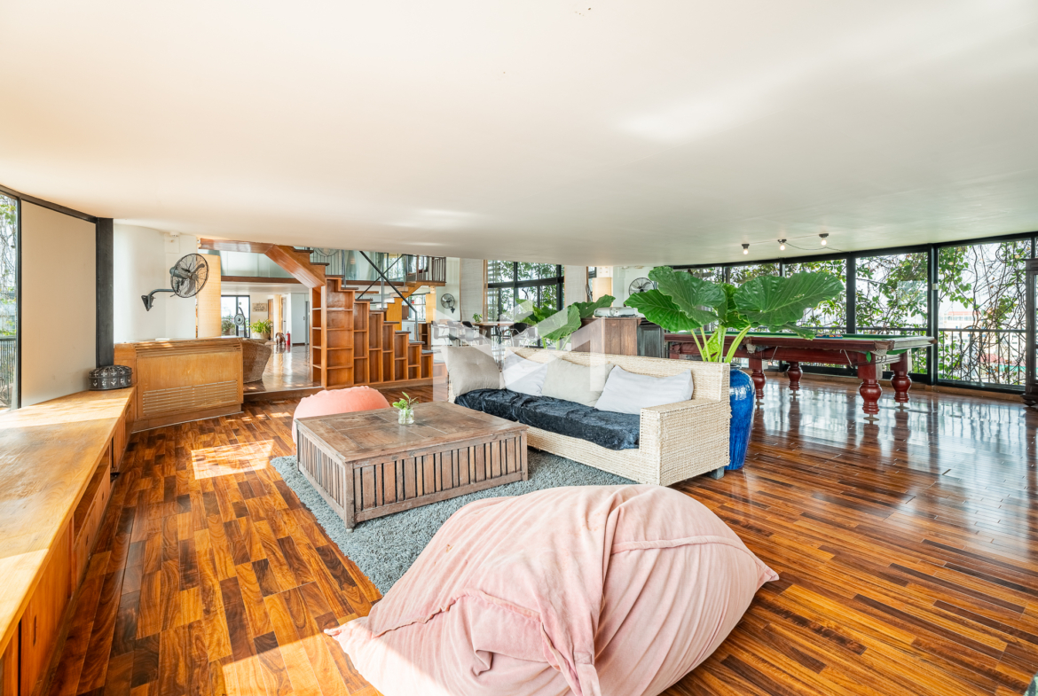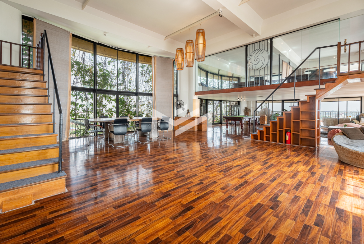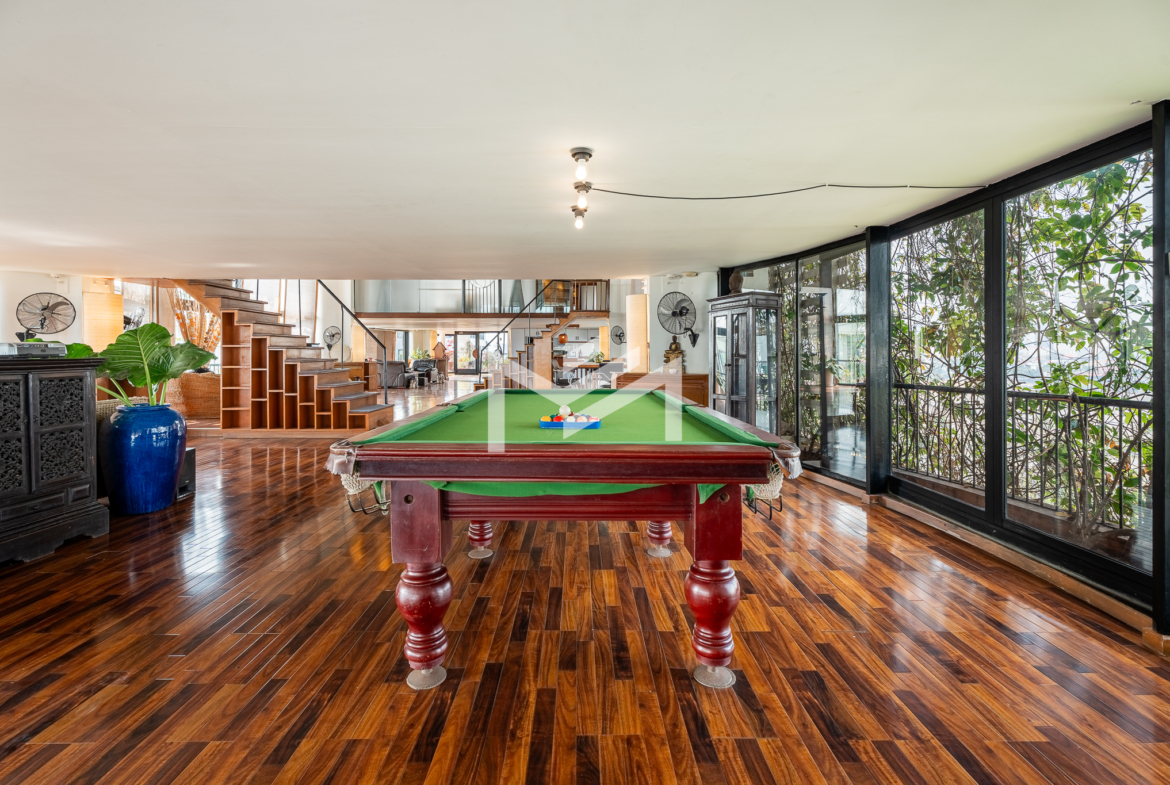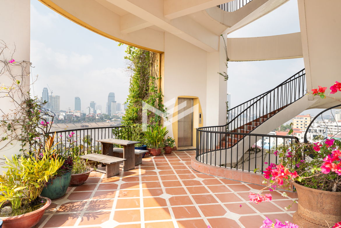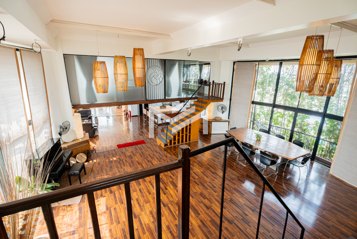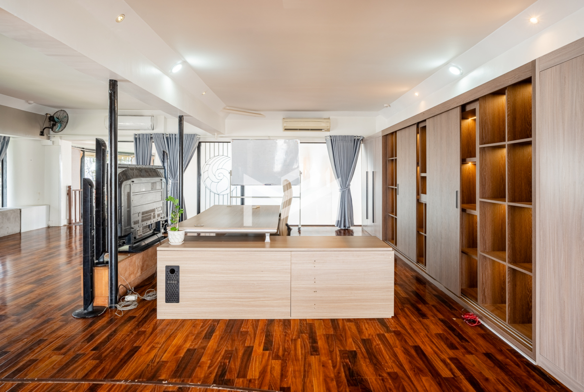 This 650 sqm penthouse office offers breathtaking views of both the Tonle Sap and Mekong Rivers, creating a calm, green environment ideal for productivity and creativity. The space features a large open-plan layout with private mezzanine offices, generous relaxation areas, and casual meeting spaces that support both collaboration and focused work. The office is equipped with six air-conditioning units, two toilets, and large balconies on both sides providing uninterrupted river views and excellent natural ventilation. The building offers 24-hour security and backup generators, ensuring comfort and uninterrupted operations at all times. This is a rare opportunity for businesses seeking a unique penthouse office with river views in Chroy Changvar.