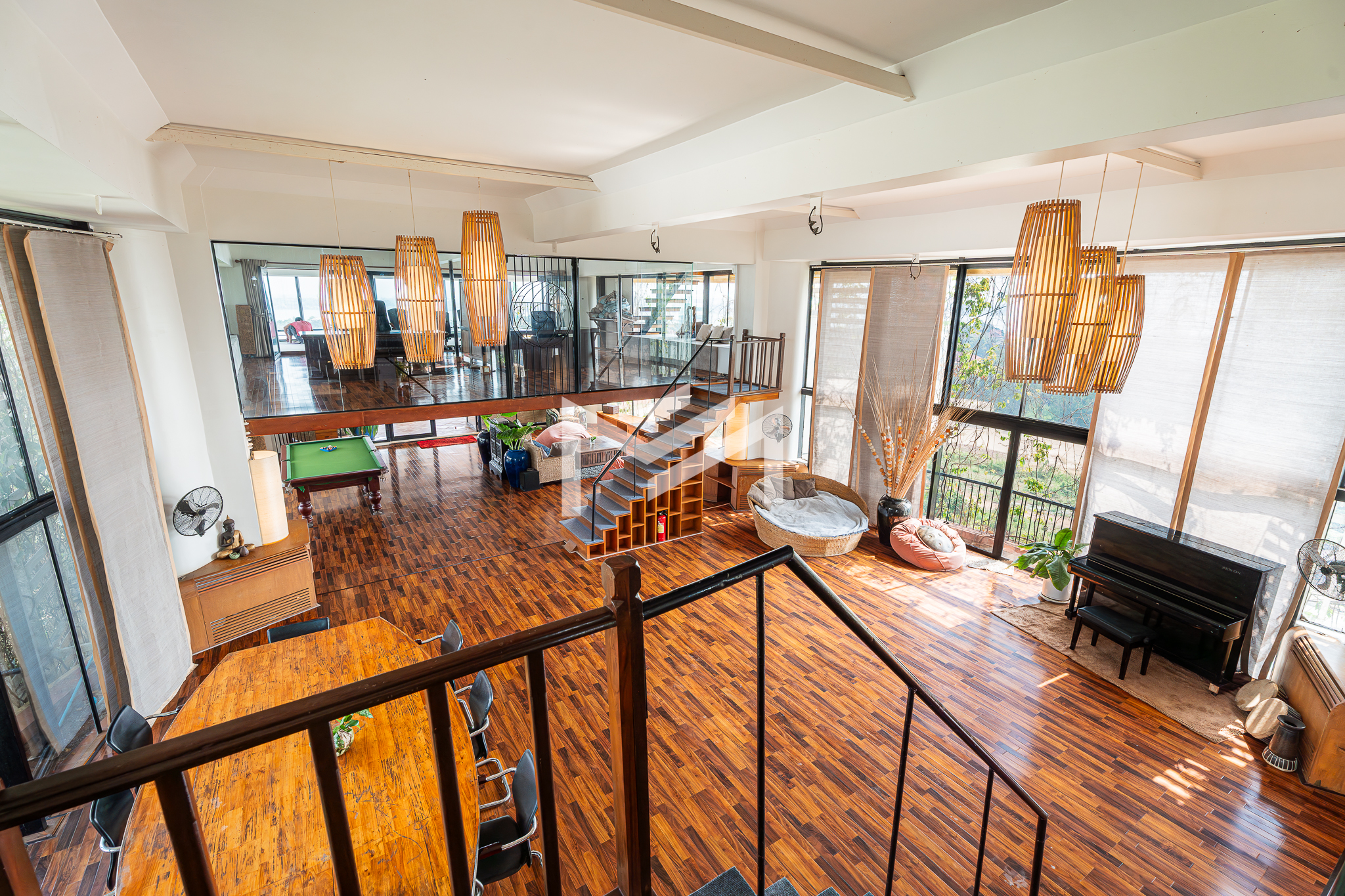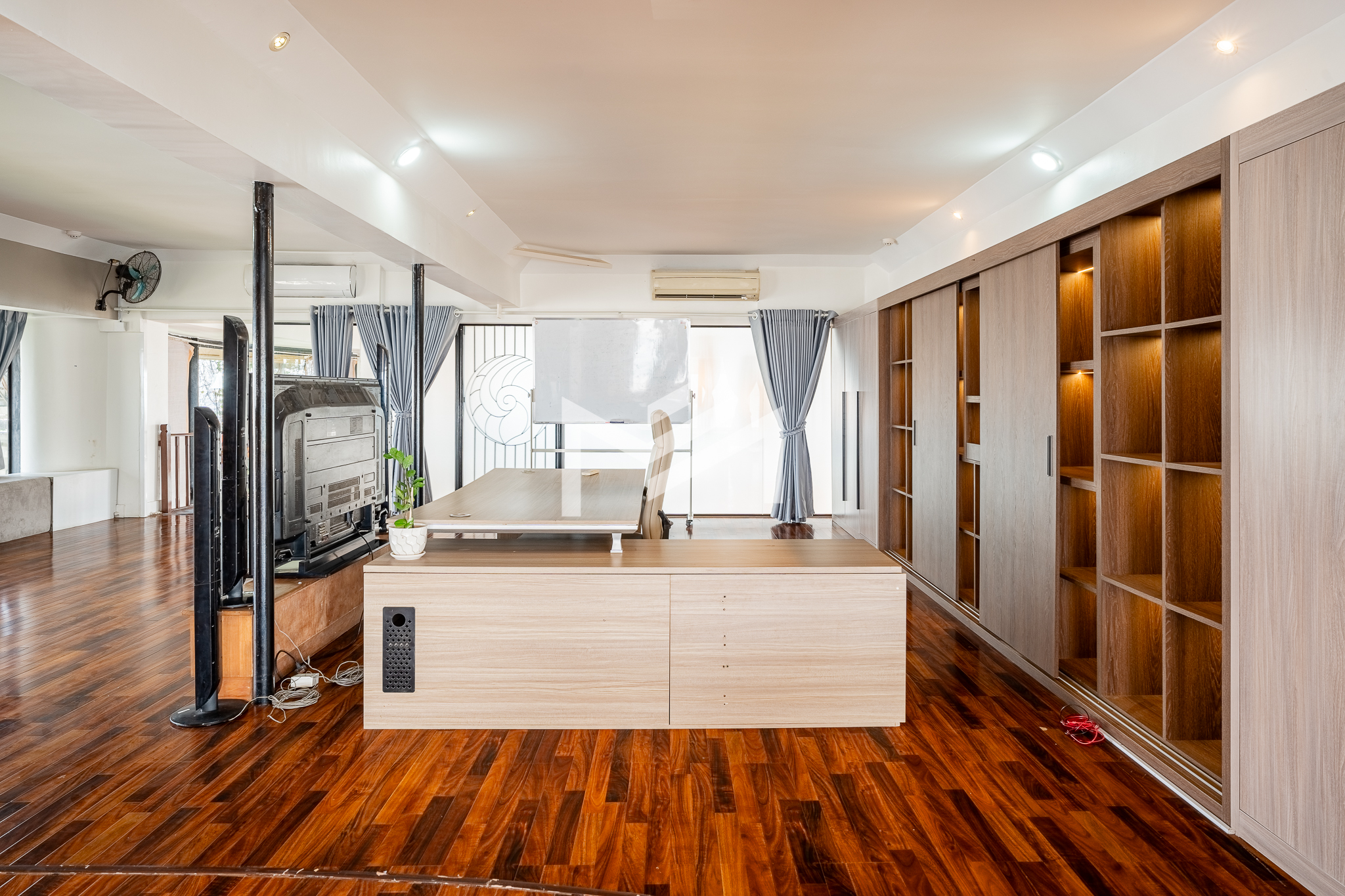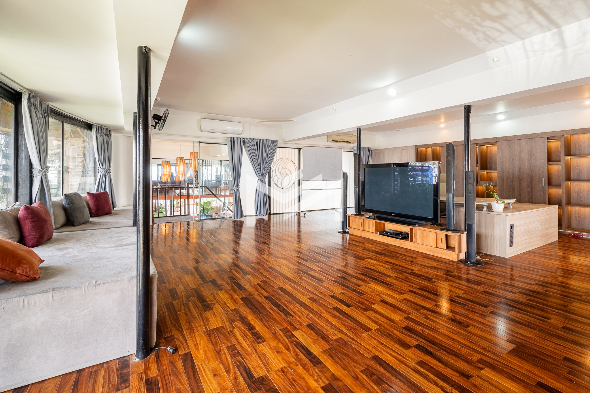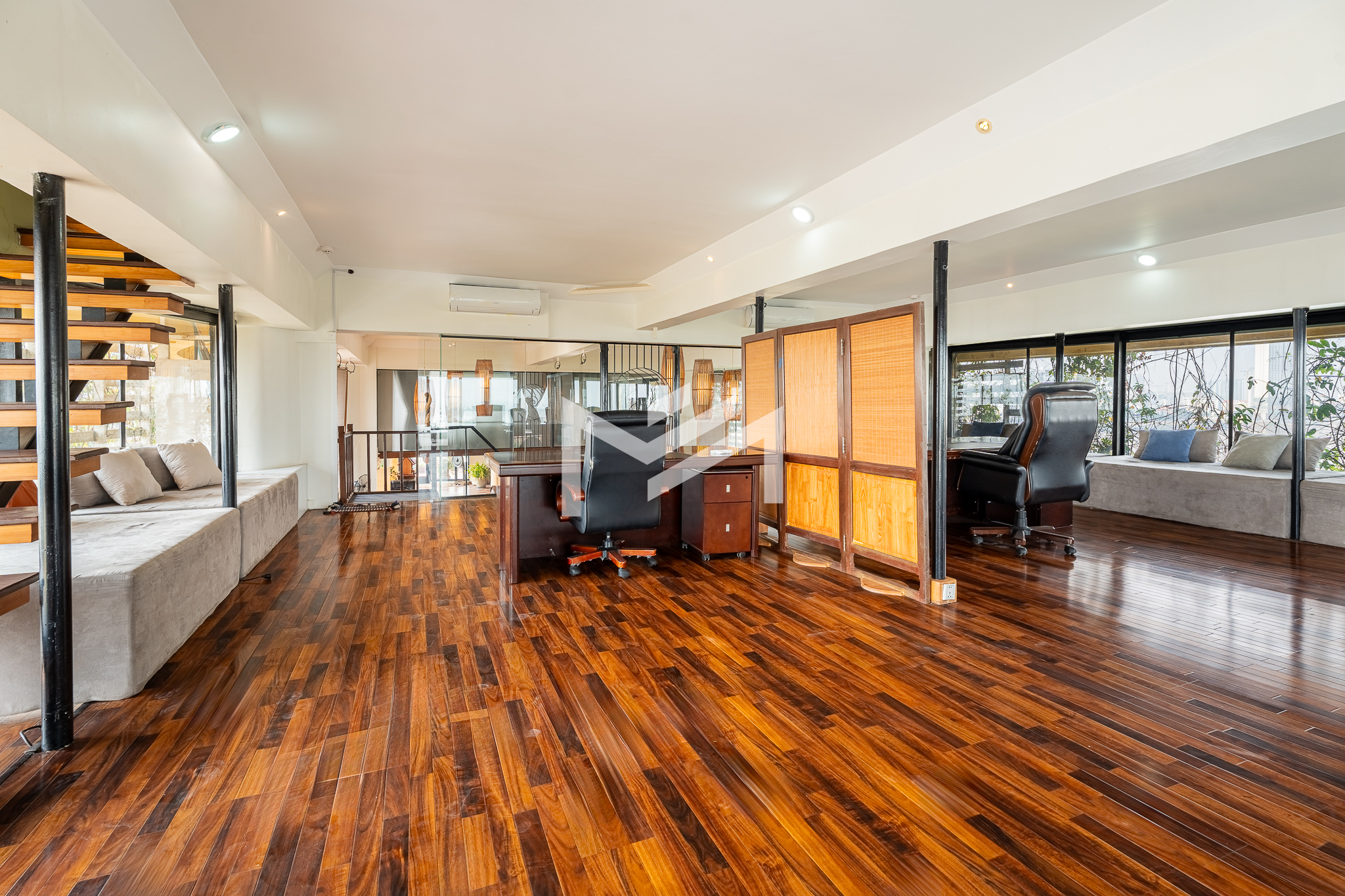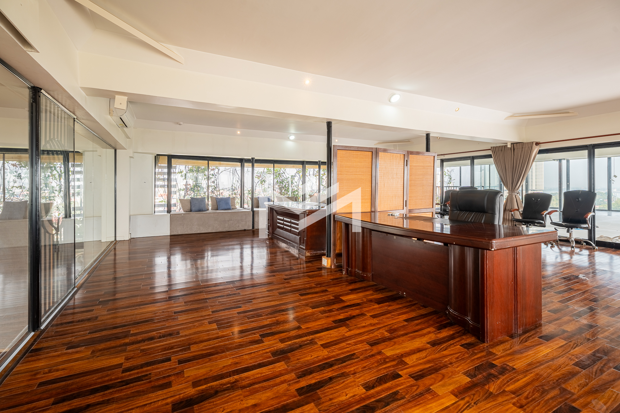 This 650 sqm penthouse office offers breathtaking views of both the Tonle Sap and Mekong Rivers, creating a calm, green environment ideal for productivity and creativity. The space features a large open-plan layout with private mezzanine offices, generous relaxation areas, and casual meeting spaces that support both collaboration and focused work. The office is equipped with six air-conditioning units, two toilets, and large balconies on both sides providing uninterrupted river views and excellent natural ventilation. The building offers 24-hour security and backup generators, ensuring comfort and uninterrupted operations at all times. This is a rare opportunity for businesses seeking a unique penthouse office with river views in Chroy Changvar.